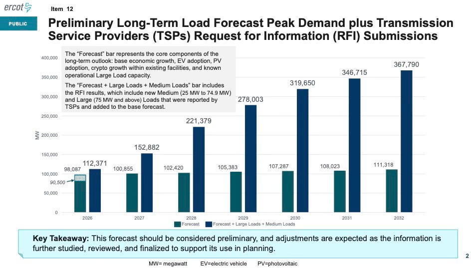 Texas peak demand on the grid has been approximately 85 gigawatts. The total generation queue over the coming years stands in Texas alone stands at 450 gigawatts: 360 GW from solar and batteries, 60 GW from gas, and 50 GW from wind. Not all of this will materialize.